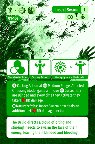 At level 1 the Druid has access to Insect Swarm, which targets Fortitude at Medium Range and if successful, the target model is Blinded and every time they activate they take 1RD damage. Blinded causes the target model to have a maximum Accuracy of 0, meaning they are highly likely to miss when making an action that uses that Offensive Modifier which includes all normal attacks. Using this on a key enemy model that specializes in physical attacks is absolutely crippling, and the chip damage over time only sweetens the pot. You can upgrade this spell to deal 2RD per Activation with the Nature’s Sting Feat which turns the damage from an annoyance to truly worrying.