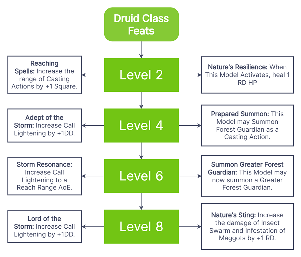 Finally at level 8 the Druid may select between Lord of the Storm, which further increases the damage of Call Lightning by +1DD or Nature’s Sting which increases the damage of Insect Swarm and Infestation of Maggots by +1RD per turn. If you are going all in on the nuke Druid, you probably will take all of the feats on the left side of the tree to have an uber lightning blast each turn. However, do not sleep on the increase from Nature’s Sting as potentially doing a passive 2RD to two opposing models each turn for the whole game is a LOT of damage cumulatively. If you were to cast both on the first turn and they were not removed you are talking potentially 24RD damage over 6 turns which is wild. Again, it just comes down to how you want your Druid to function. A tough call but then that is the fun of a game like this!