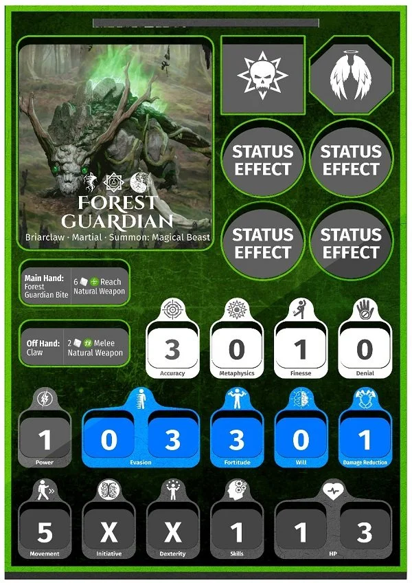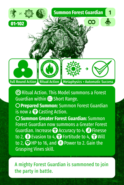 At level 4 you can opt to take the Prepared Summon Feat which makes summoning a Standard Action instead of a Ritual Action. This helps increase action efficiency for the Druid considerably so they aren’t spending their first turn only summoning. At level 6 the Druid can take the Summon Greater Forest Guardian Feat which gives a big boost to the summon. This gives the Forest Guardian a +1 boost to Accuracy, Finesse, Evasion, Fortitude, and Power, +2 to Will, +3 HP and gives the Forest Guardian an additional Skill: Grasping Vines.