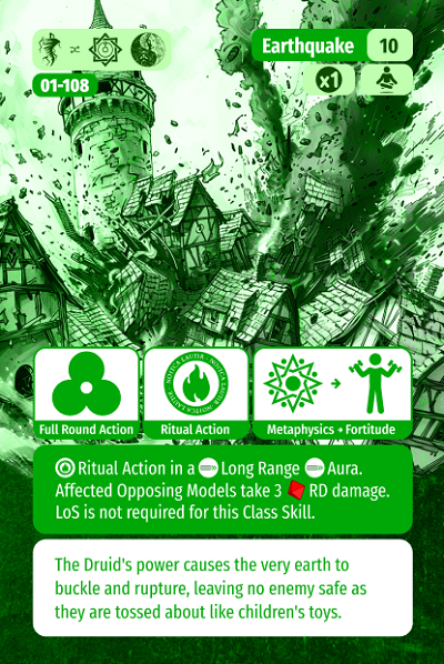 At level 10, as with all Classes, you get the ultimate ability of the Druid. All Ultimate skills are automatically added to your deck if you hit level 10, they do not take up one of your class skill choices. As with all Ultimates, this is a Once per Game ability. Earthquake is also a Ritual Action just as with Hurricane Winds. This spell is wild, it targets all Opposing Models on the entire board, no Line of Sight required, and those affected take 3RD damage! Absolutely brutal. If you manage to max level the Druid, you will be able to play this card with an evil grin on your face!