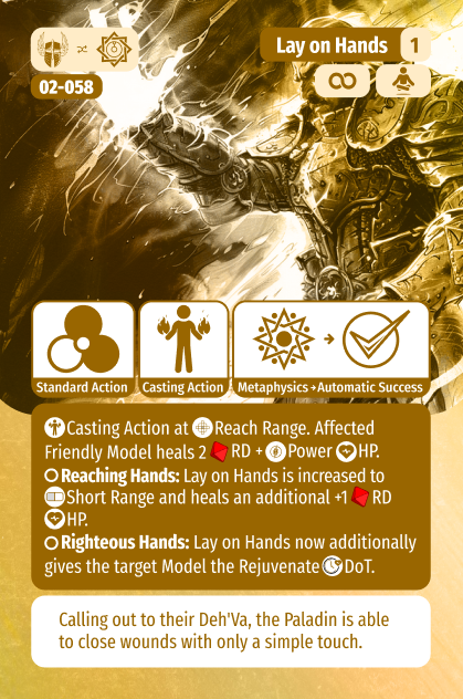 At level 1 you gain access to the quintessential Paladin ability: Lay on Hands. This is a reach range healing ability which heals the target (and yes, the Paladin can heal themself) for 2 Raw Dice + Power HP. This can be upgraded with two feats, Reaching Hands increases the skill to Short Range and adds +1 Raw Dice to the healing pool, and Righteous Hands means the target also gains the Rejuvenate HoT, meaning them will heal an additional 3 Raw Dice of HP over time. As it is a Casting Action, the Paladin can use Mobile Casting, meaning they move and then use it, with a chance of failure, but means they do not sacrifice mobility. This does mean it can trigger Attacks of Opportunity though so be mindful, although that can further potentially trigger your No Blow Unanswered! Chain attack! An all around great ability and if you invest the feats into increasing the efficacy, means they have a healing ability that is extremely potent. If nothing else, they can use it on themself to stay in the fight longer. This means the Paladin is a great choice for the Warlord’s Haste buff (or any source of Haste) as with the extra action they can punch twice and heal themself.