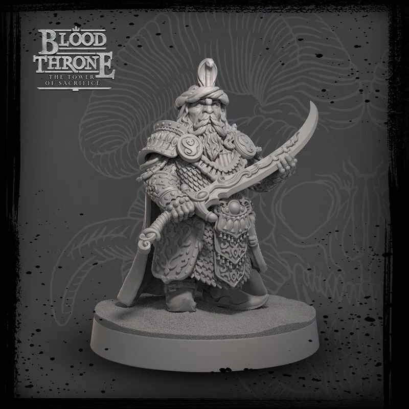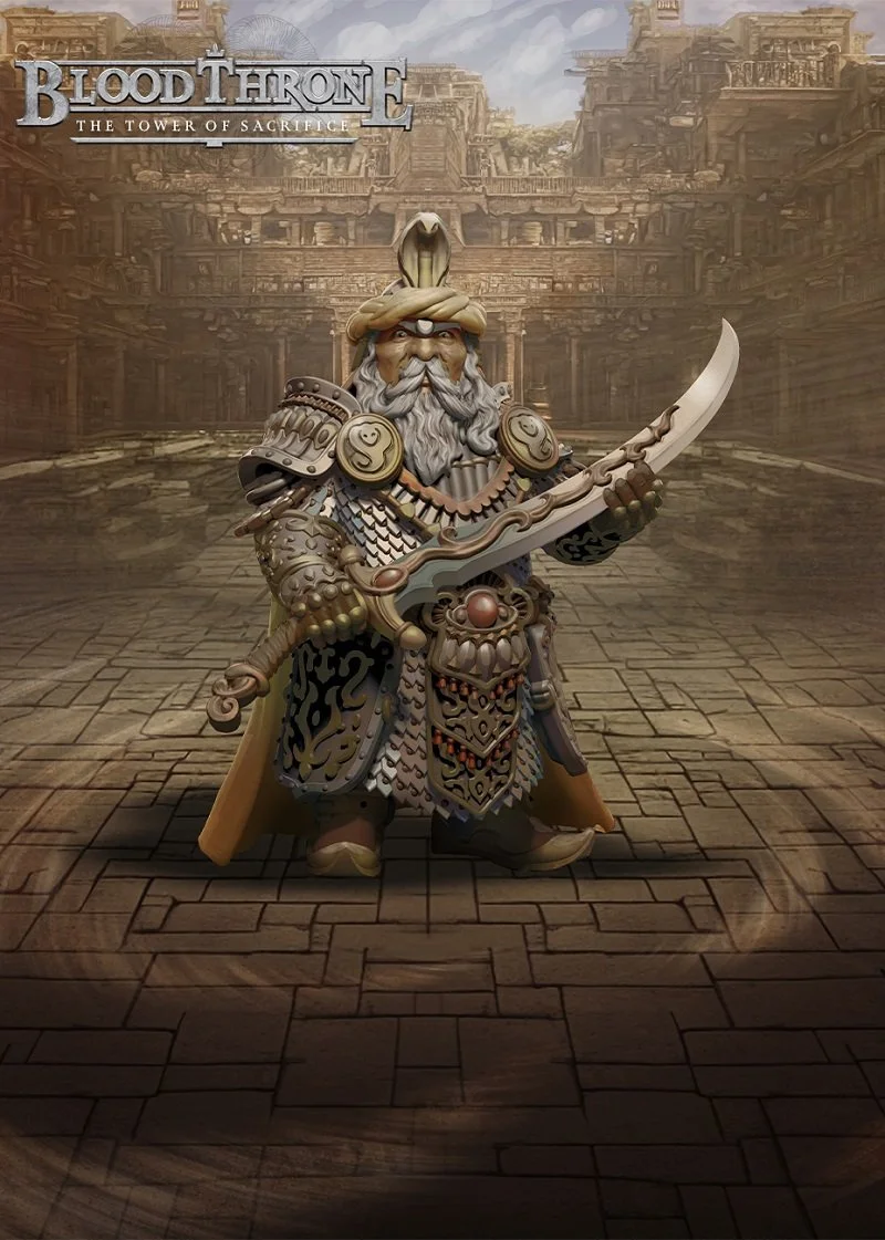 Saabir was a really fun hero to write. He comes from the Arabian Nights inspired faction, Kushna, which we had a blast writing. He is a Desert Dwarf, and the last living Paladin of the Order of the Zaied Habbak. Kushna was devastated during the Throne Wars and their magnificent capital city, Ira’Bar, was destroyed. As such, Saabir is on a quest for vengeance and to try and find some way to restore his faltering people. He is a serious character, and an absolute menace on the tabletop. Plus I just love the model and art for him, such a cool looking character.