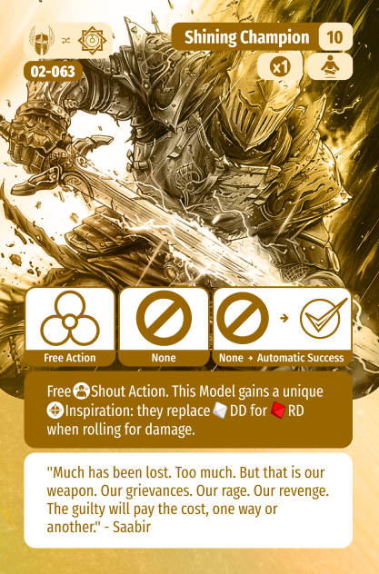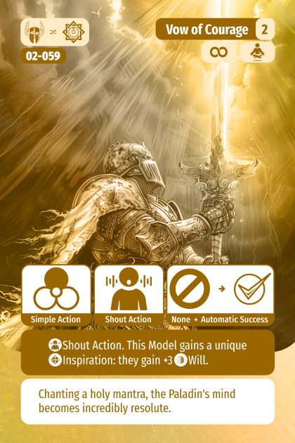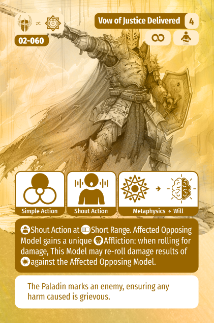 The Paladin has several Shout Action options which as with other classes are a Simple Action, meaning they do not take away from your core ability to move and punch. Thematically they represent the paladin making a scared promise to accomplish a deed, and using their faith to achieve it despite any odds. This Vow, available at level 4, is a short range shout targeting Will which if successful, allows the paladin to re-roll explosion results when attacking the afflicted model. As a quick reminder, when rolling damage explosion results are 0 damage. This pairs obviously with their core function of kicking butt, enabling the Paladin to lay low their foes.