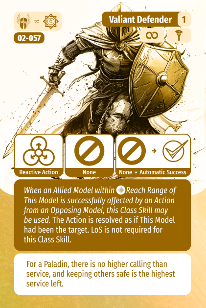 At level 1 the Paladin may select Valiant Defender, which is a Reactive Action allowing them to change the target of an action from an ally within Reach Range of the Paladin, to themself. This is incredibly useful to avoid one of your Party Members from either getting knocked out or taking an attack or effect they absolutely do not want. For example, if one of your magic users is about to get Silenced, dropping their Metaphysics to 0, if the paladin intercepts that it is much less debilitating for them. Or, an attack that would deal a lot of damage to an ally, that merely tickles the heavily armored Paladin, etc. And as always, Reactive Actions are basically free extra actions so are always useful from an action economy perspective.