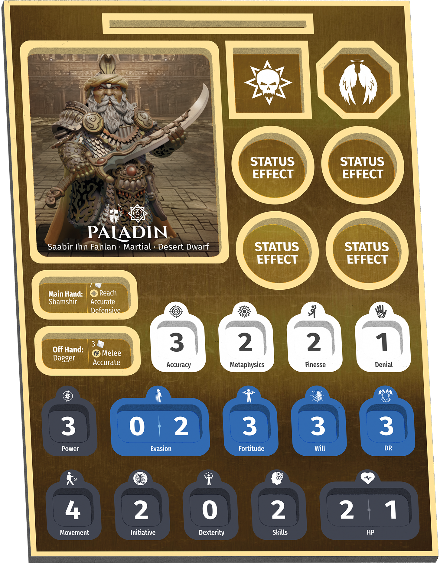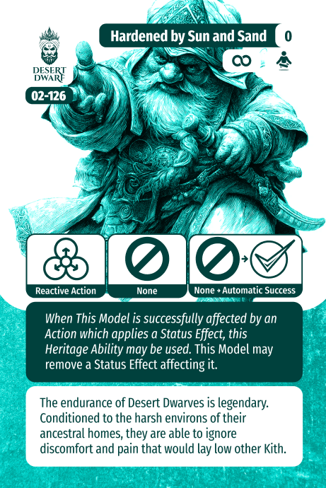 The Heritage Skill of Desert Dwarves is extremely useful. Due to their harsh lives in the desert, they have become extremely resilient. Once per game, as a reactive action, you can remove a Status Effect. Why this is so good as it happens immediately, so as soon as you are hit with an Affliction or Curse, you play the card and just remove it. In PvP this means often you won’t be targeted by a curse as it will be a waste. This really helps Saabir avoid being smacked with a debilitating debuff.
