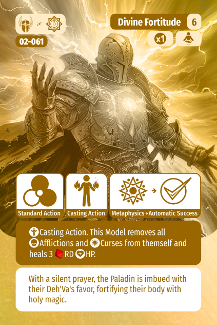 At level 6 the Paladin gains a once per game ability to both heal themself for 3 Raw Dice and also to remove all Curses and Afflictions from themself. This is massively useful as some Curses (game long debuffs) can really be debilitating. If you are debuffed into uselessness, pop this card and be rejuvenated! Often simply having it in your deck can be enough to discourage an opponent from debuffing the Paladin at all.