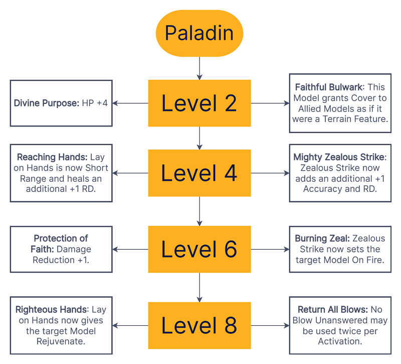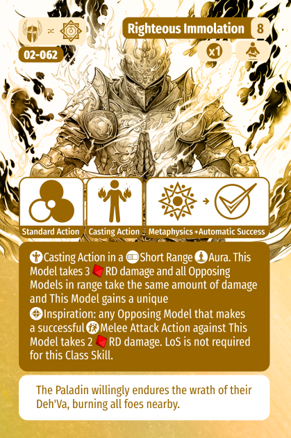 At level 8 the Paladin gains Righteous Immolation, which is a Casting Action in a short ranged Aura, ignoring LoS, and is once per game. The Paladin takes 3 RD damage and all opposing models take the same amount of damage. What makes this so good is that it automatically hits! That is a solid trade off for the Paladin taking damage, and it hits models the Paladin cannot see. Additionally, the Paladin for one turn will deal 2 RD damage to any model that hits it with a melee attack. This ability is great for running into a cluster of enemies and dealing a ton of damage with no roll required. Particularly in PvE adventures, where monsters will then attack you, you can passively take a bunch of them out! In PvP it means your opponent will likely not attack the Paladin unless they are confident they can finish them off.