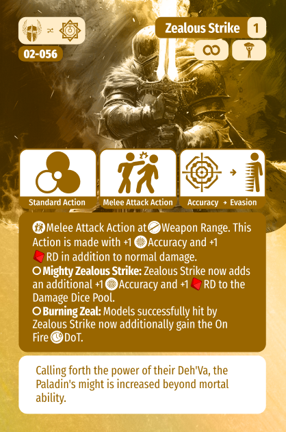 Zealous Strike is available to choose at level 1, and is a bread and butter ability. It is a straight melee buff, giving the Paladin +1 Accuracy and +1 RD to a melee attack. Simple and highly effective, hit more often and harder! You can enhance this ability with two feats: Mighty Zealous Strike increases the skill to +2 Accuracy and +2 RD damage. Burning Zeal then also means the Paladin sets the target of Zealous Strike on fire! Just an all around fantastic Class Skill which means the Paladin is highly likely to connect and deal devastating damage when they need it.